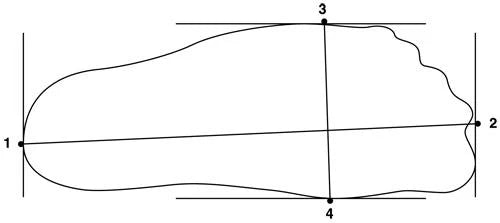 - Step 2: Length measurement (Points 1 to 2 as shown below). Use a millimeter ruler to get the measurement of the longest distance from heel to longest toe (first or second toe).